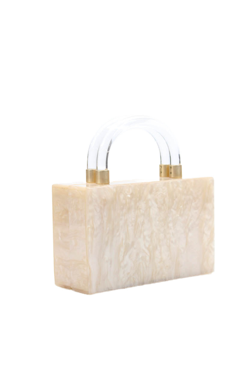 Trousseaux Womens Marble Print Classic Pearl Strap Top Handle Handbag Beige