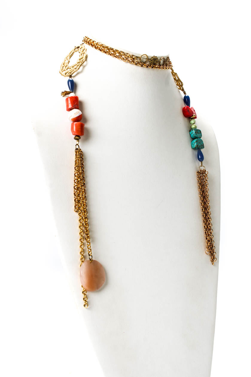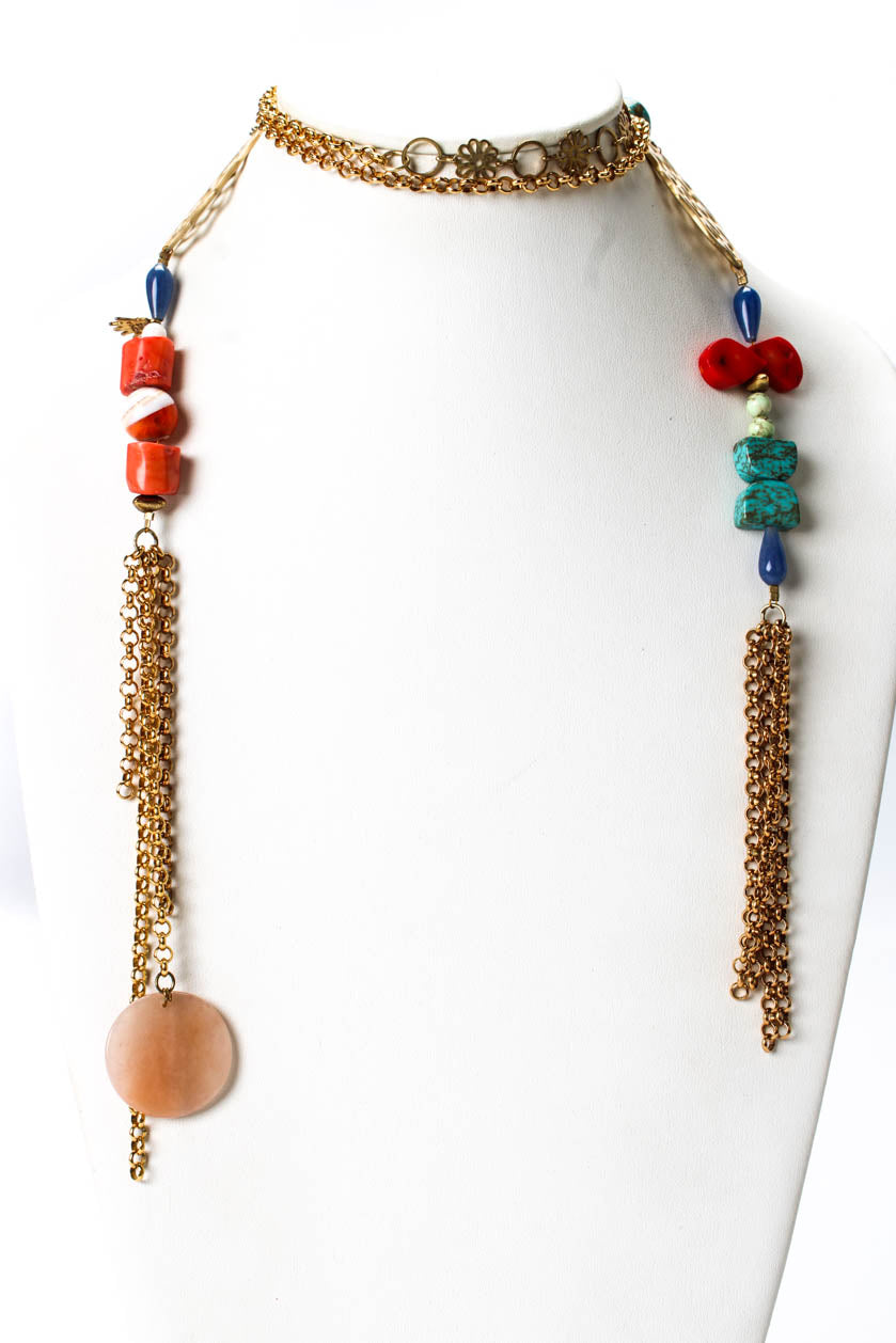 Designer Womens Gold Tone Coral + Turquoise + Glass Bohemian Scarf Necklace 50"