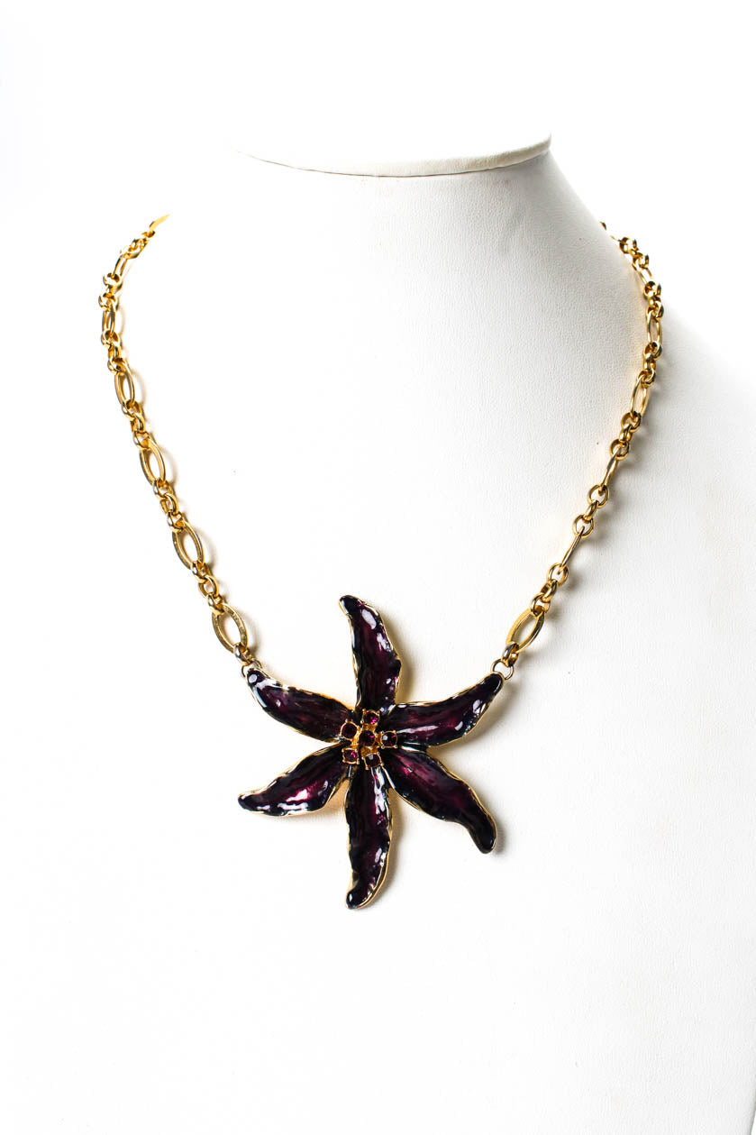 Kenneth Lane Womens Vintage Gold Tone Purple Enamel + Crystal Lily Pendant Neckl