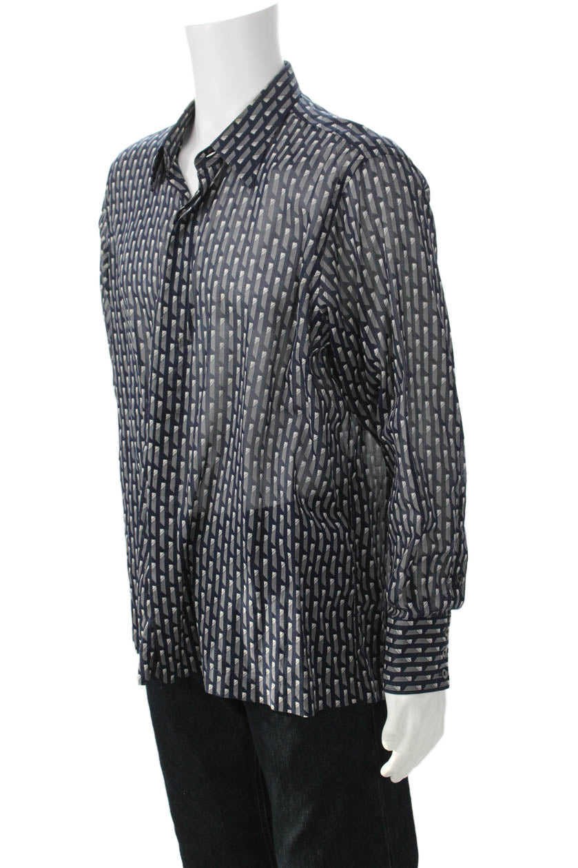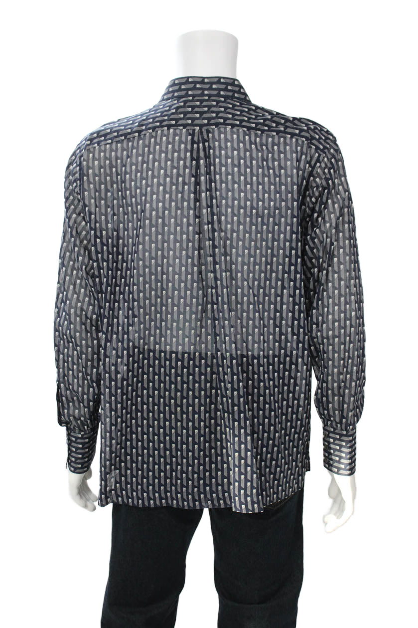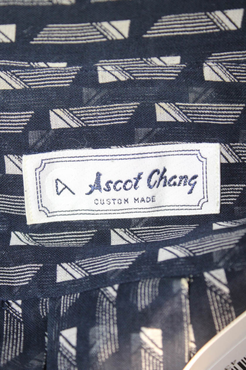 Ascot Chang Mens Button Front Collared Sheer Geometric Shirt Navy White Large