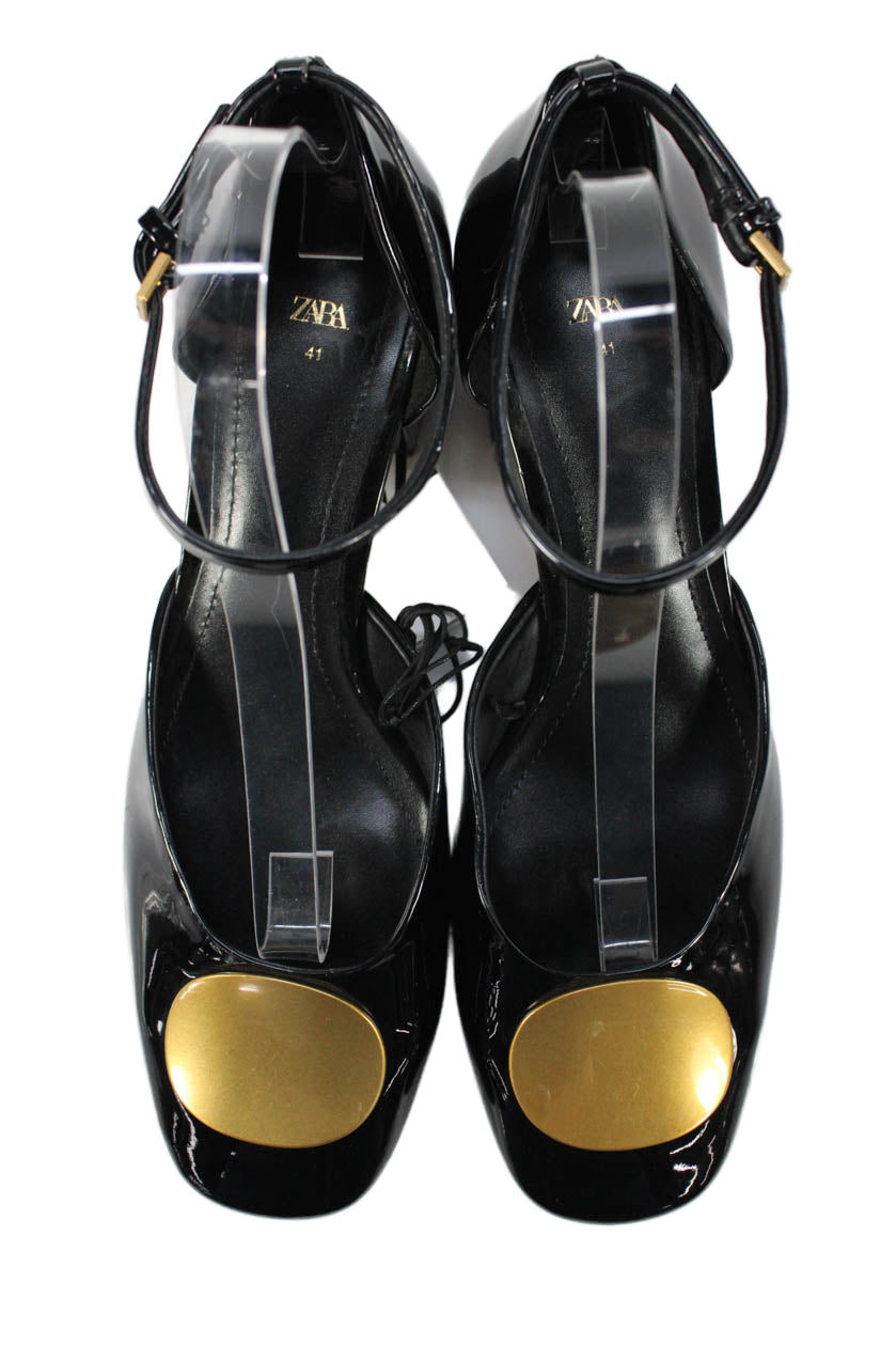 • Zara Womens Patent Leather Gold Tone Ankle Strap Pumps Black Gold Size 41 11
