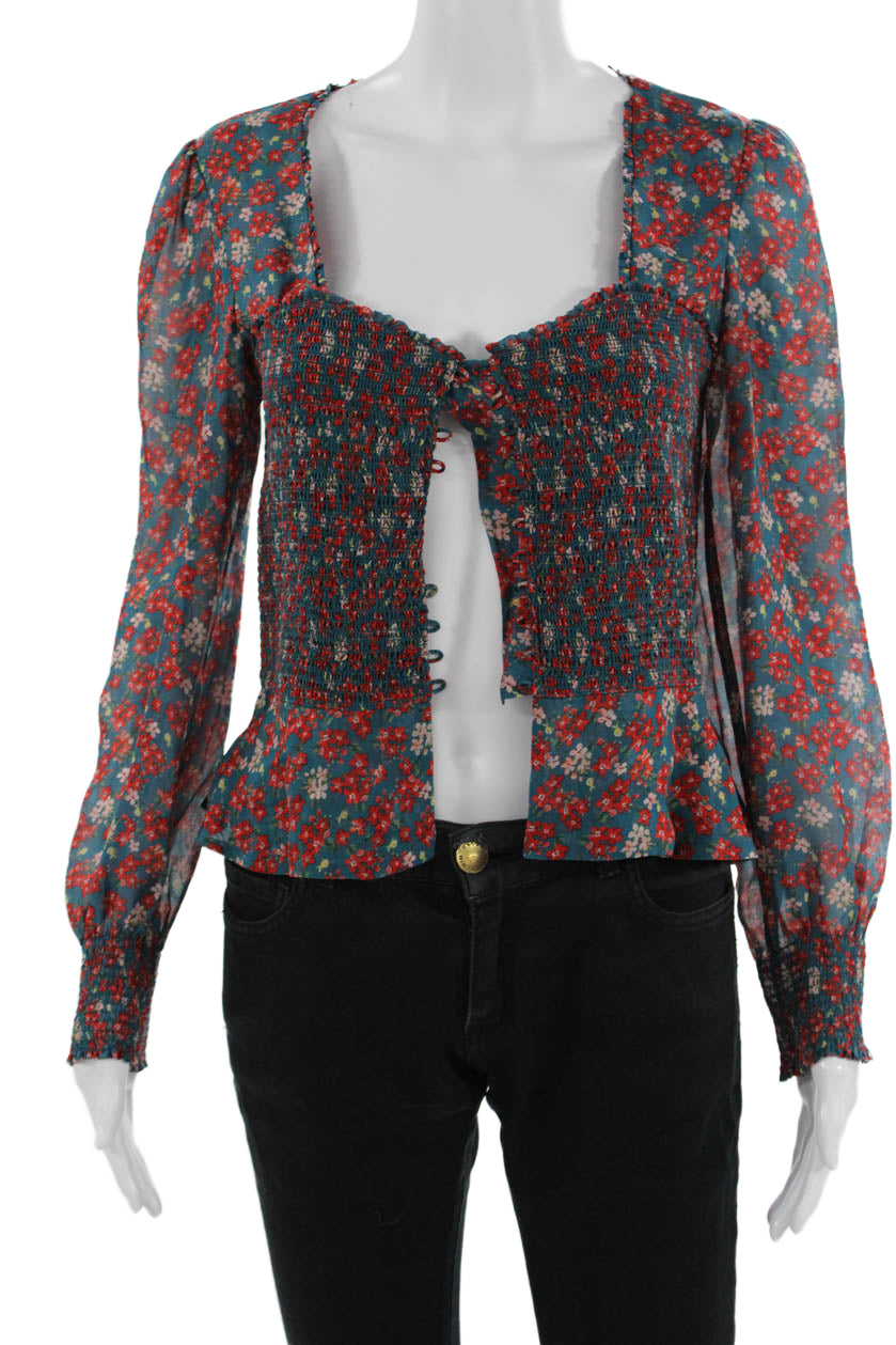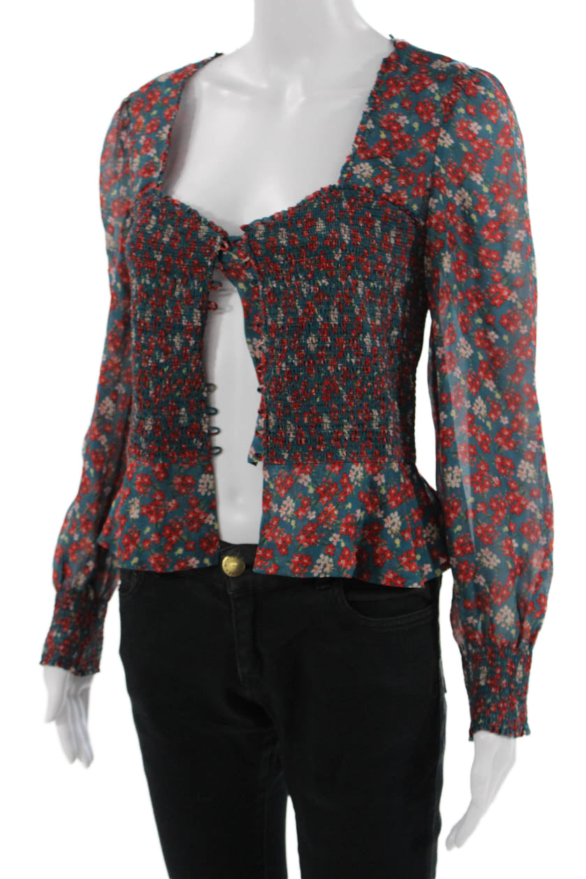 Intermix Women Blue Floral Viscose Square Neck Boho Blouse Long Sleeve Size 4