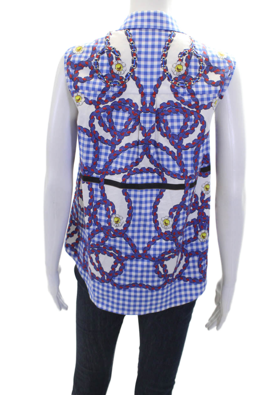 Mary Katrantzou Womens Check Print Embellished Sleeveless Button Up Blue Size 4