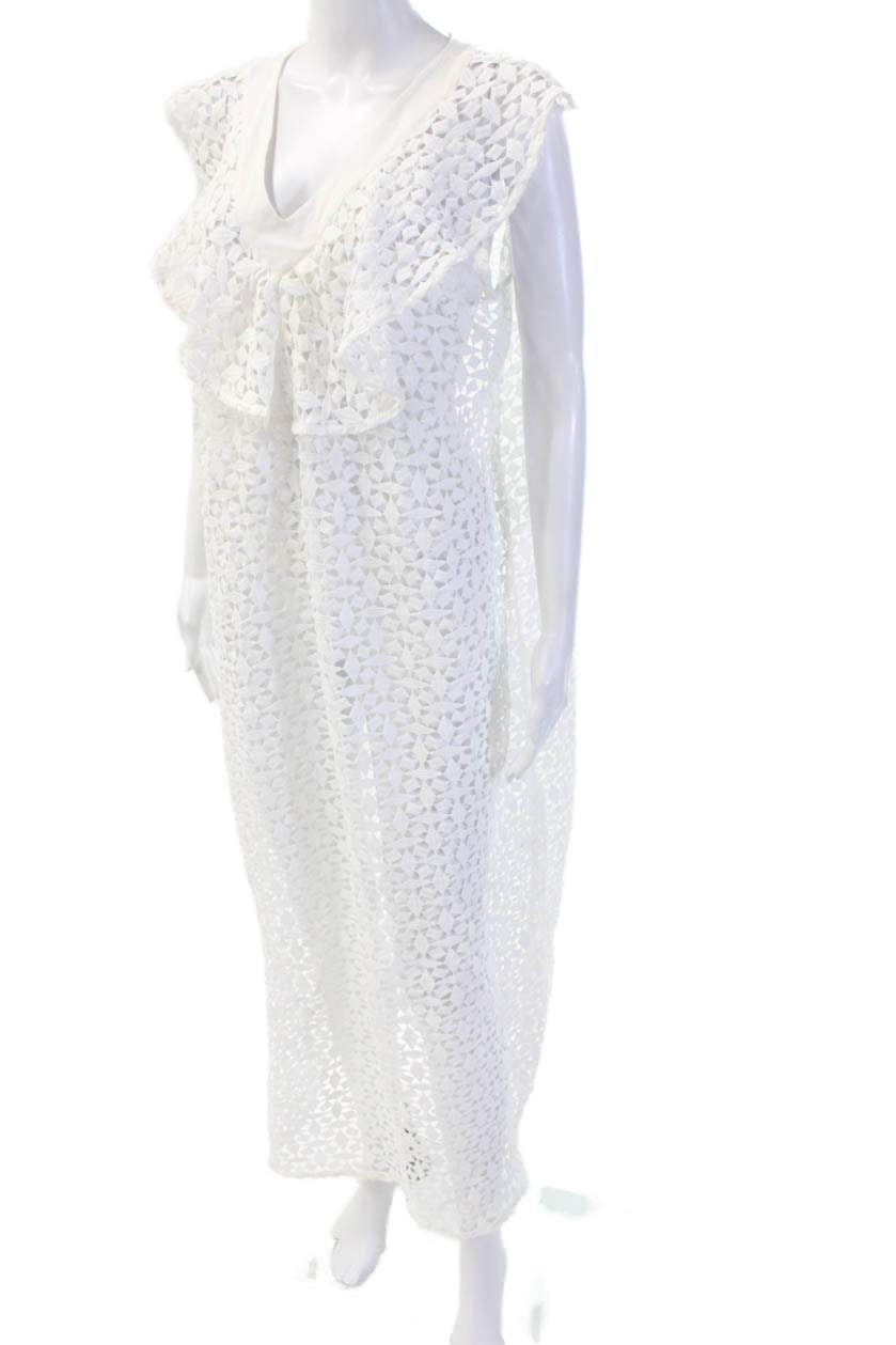 Vita Grace Women Kaftan Maxi Dress White Floral V-Neck Cotton Size M
