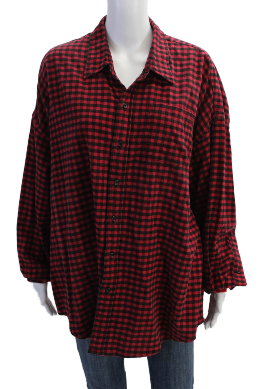 Denimist Womens Button Front Long Sleeve Collared Flannel Shirt Red White XS