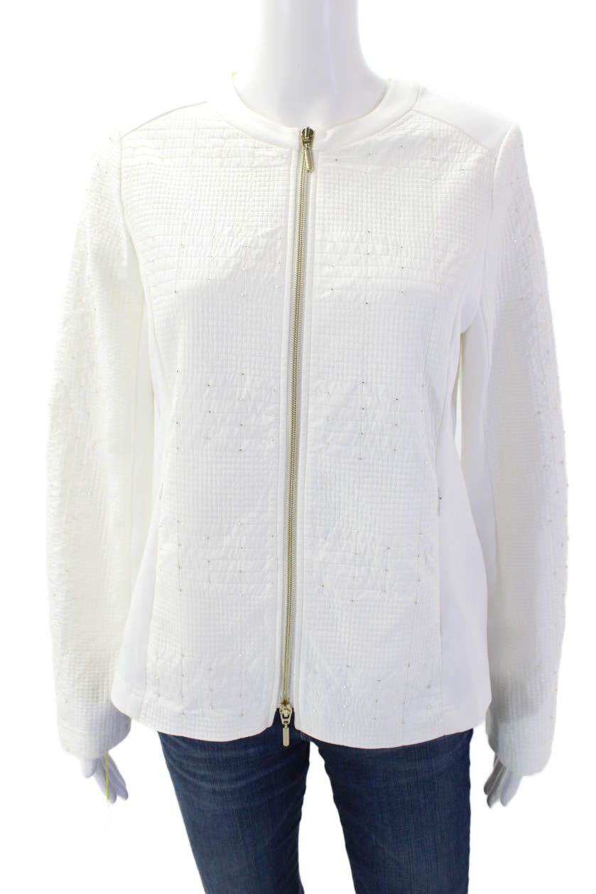 I' Cona Womens Long Sleeves Full Zip Rhinestone Studs Basic Jacket White Size 38