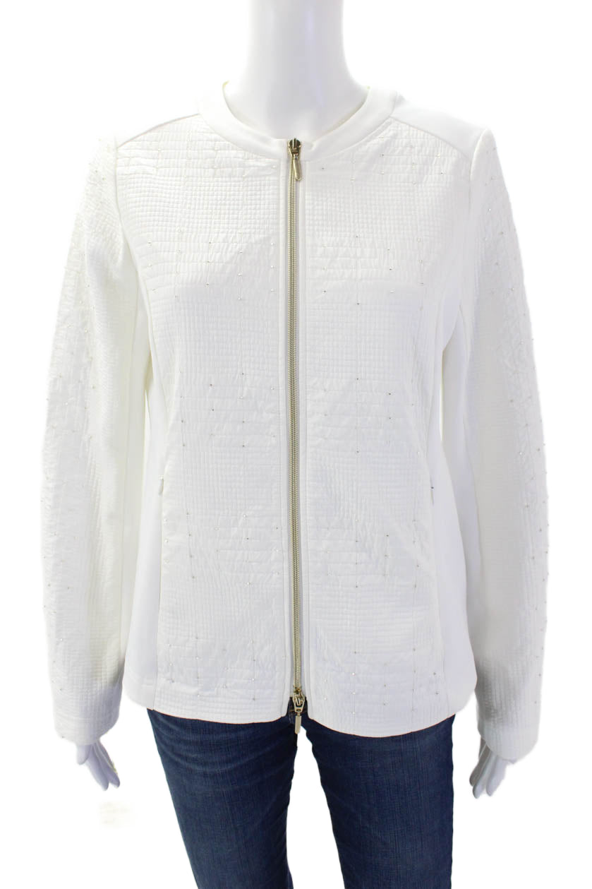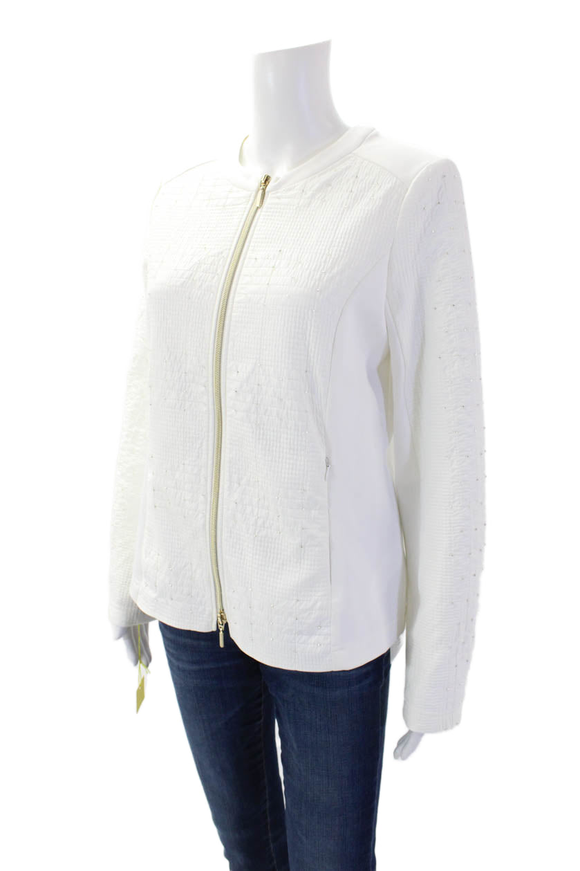 I' Cona Womens Long Sleeves Rhinestone Full Zip Round Neck Jacket White Size 42