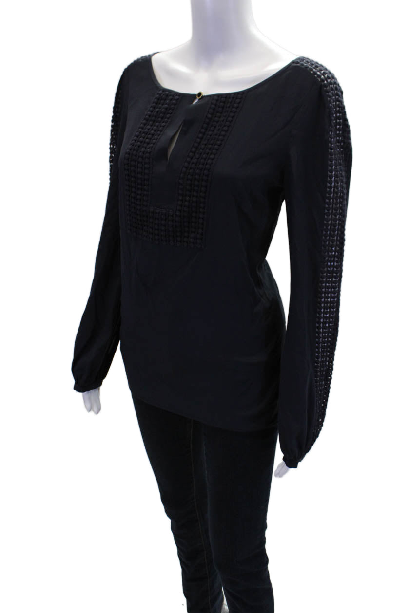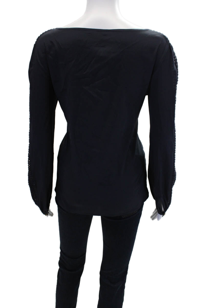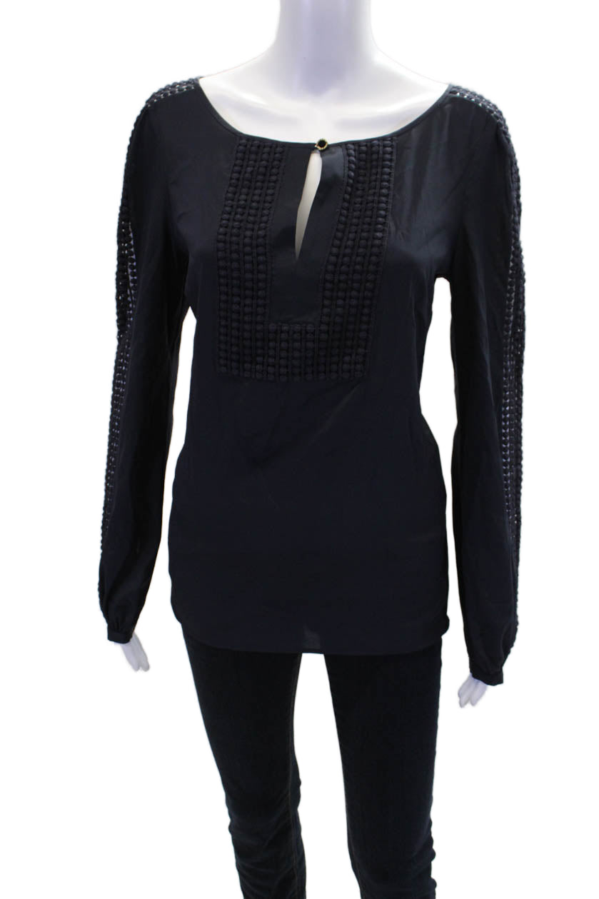 Tory Burch Womens Long Sleeve Scoop Neck Embroidered Silk Top Navy Blue Size 8